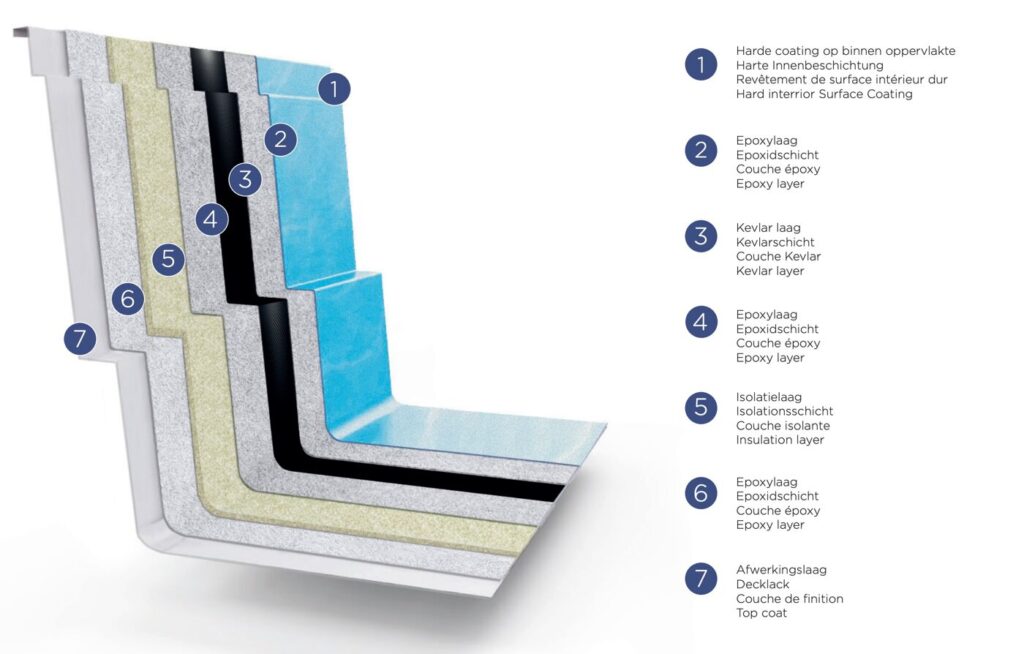 - Vinylester kuipen: Zwembaden gemaakt van full epoxy Vinylester worden vaak als één geheel geleverd en geïnstalleerd. Ze zijn duurzaam, snel te installeren en hebben een glad oppervlak dat minder gevoelig is voor algen. Ze zijn duurzaam, onverwoestbaar en ongevoelig voor osmose.